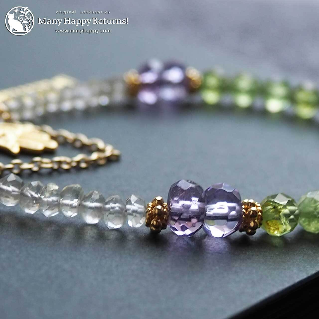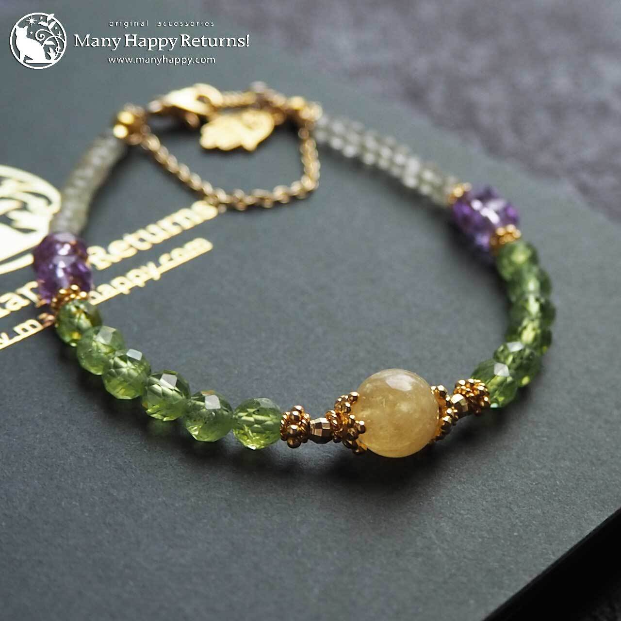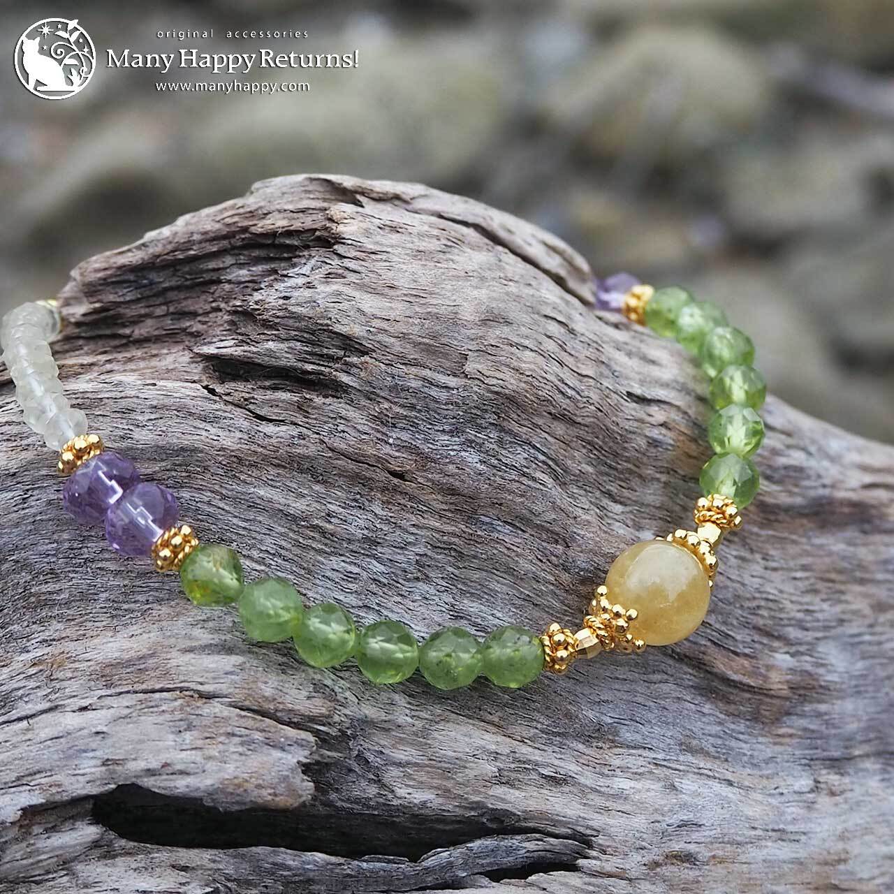 ゴールドアゼツライト・ペリドット・アメジスト・レモンクォーツを使ったワイヤーブレス。