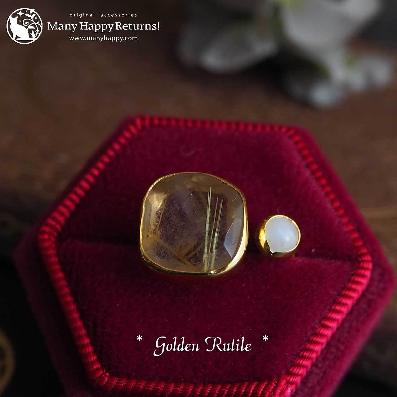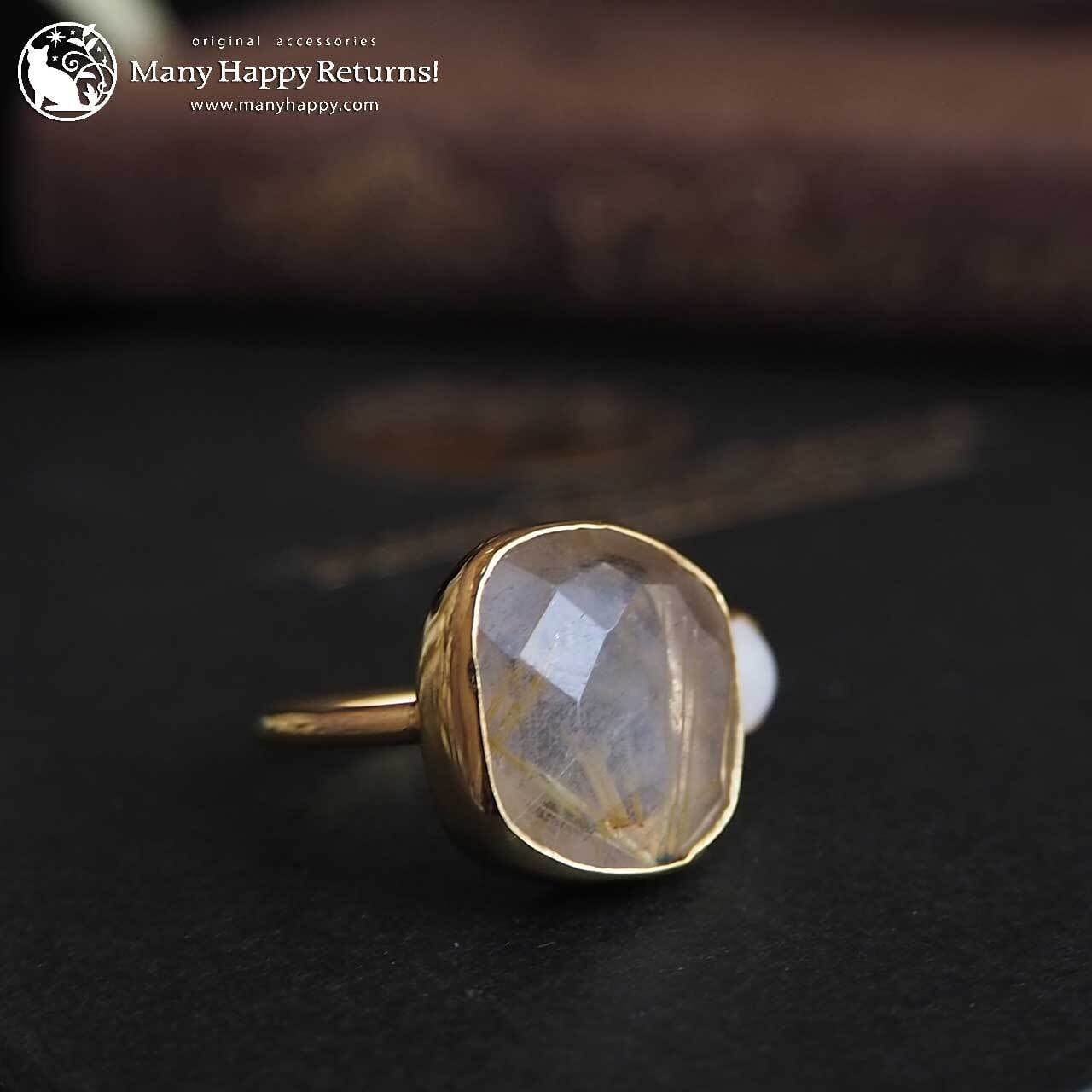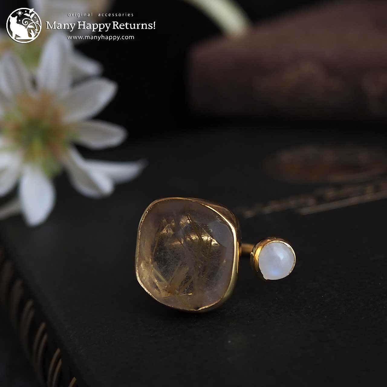 束になった上質ゴールデンルチル、タイチンルチルファセットカットにブルームーンストーンを合わせたリング。