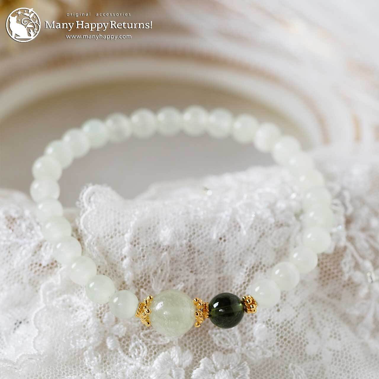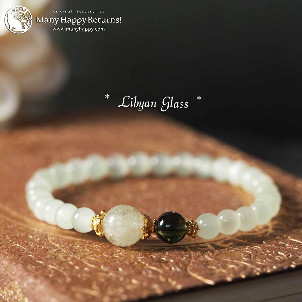 リビアングラスとモルダバイトをメインに、6ミリのグリーンカルサイトを全体に使った、細身のブレスレット。