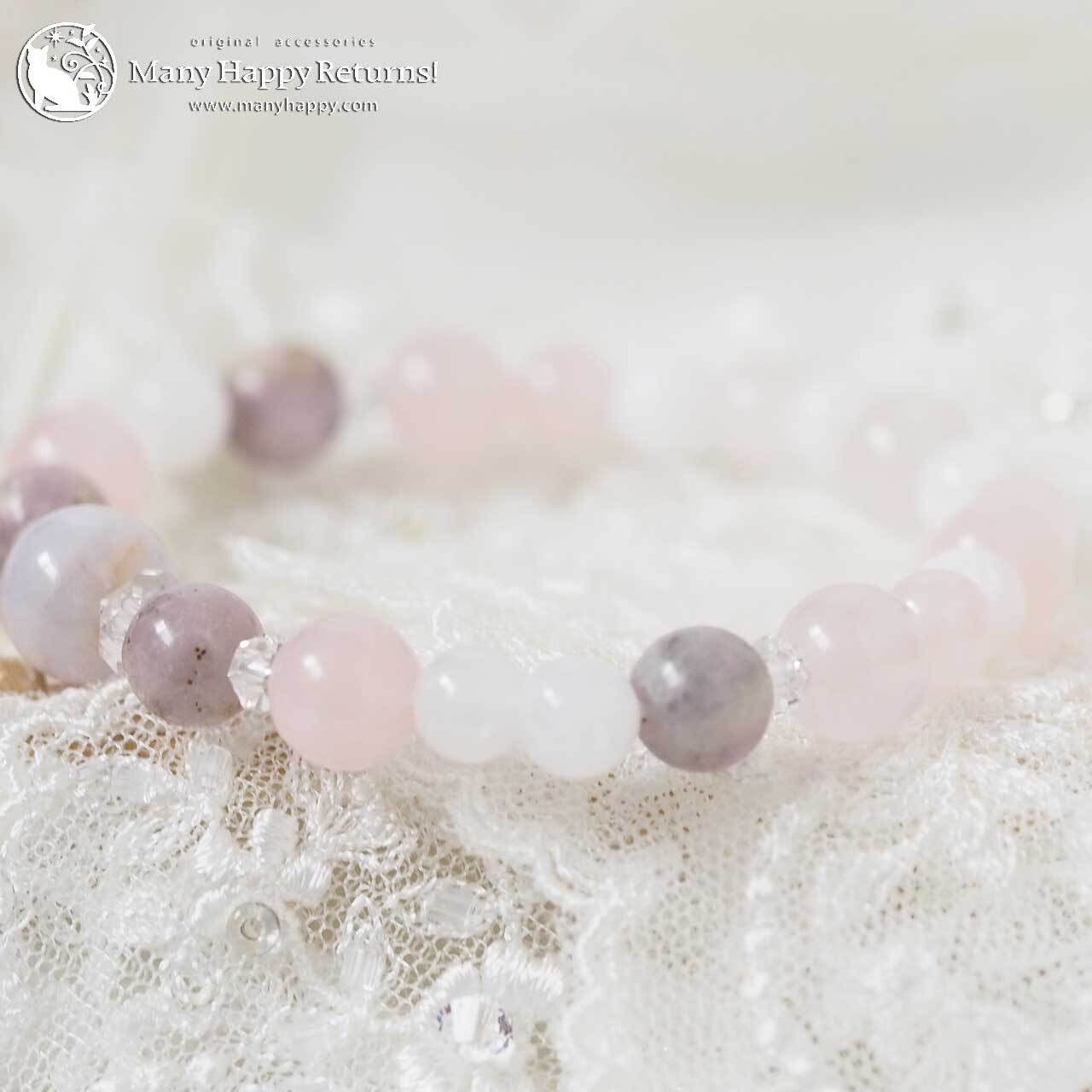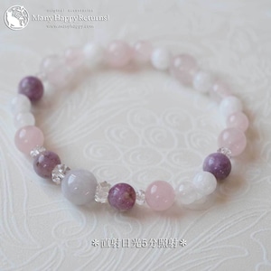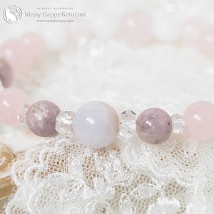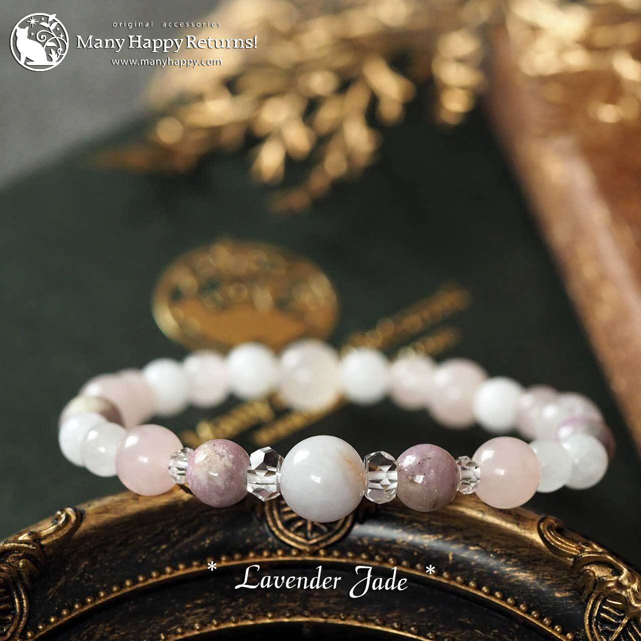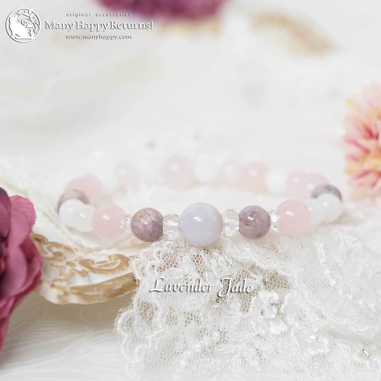 ラベンダー翡翠をメインに、ハックマナイト、ローズクォーツ、ホワイトジェイドを連ねたブレスレット。