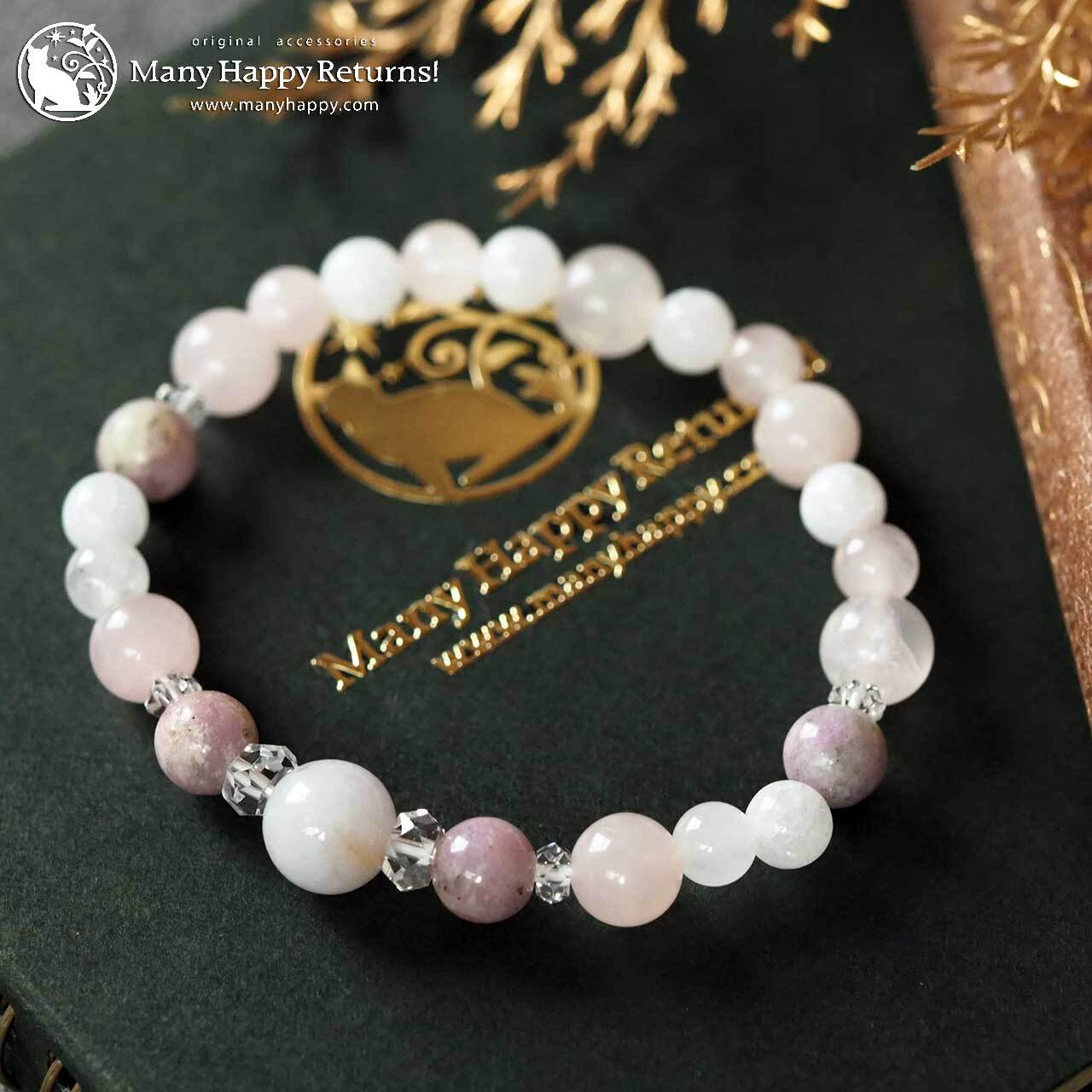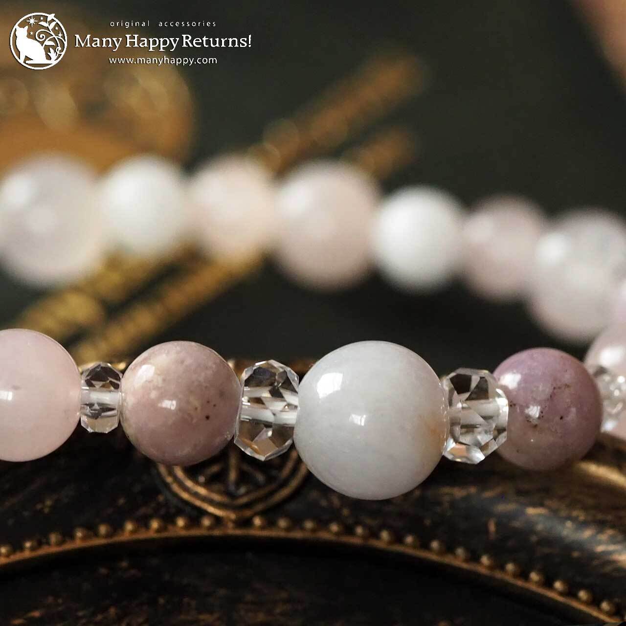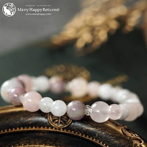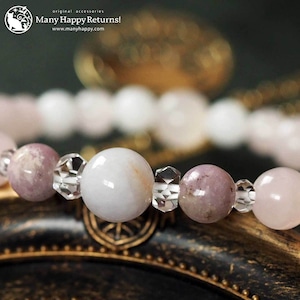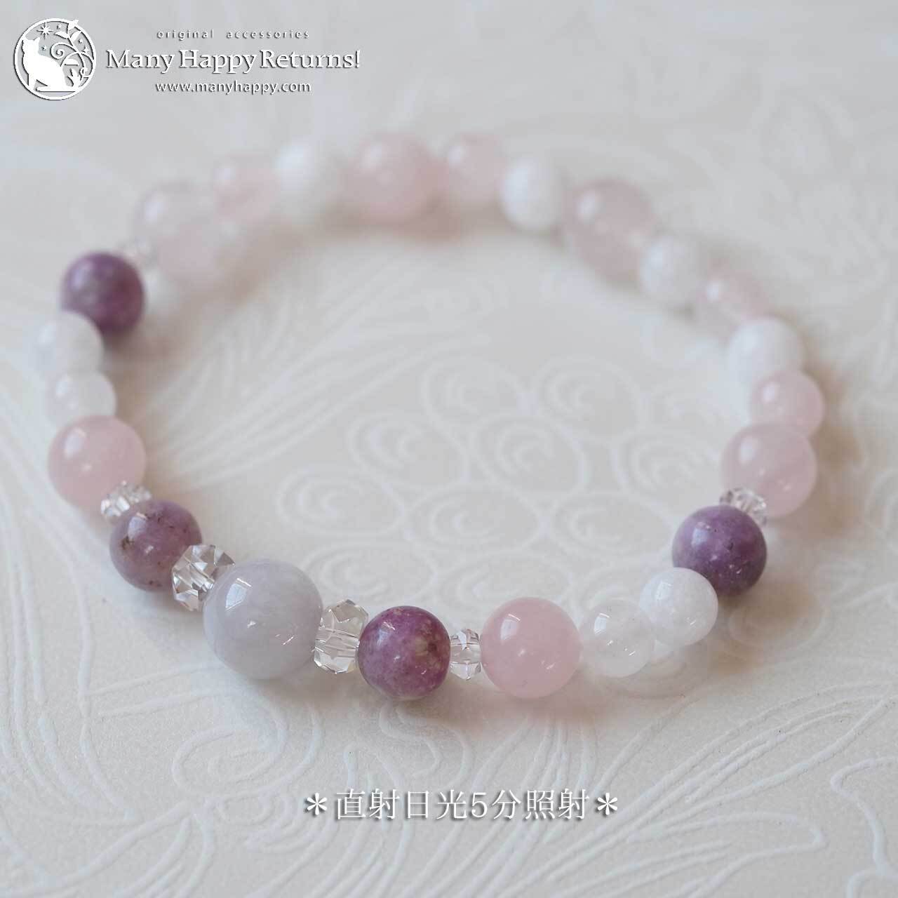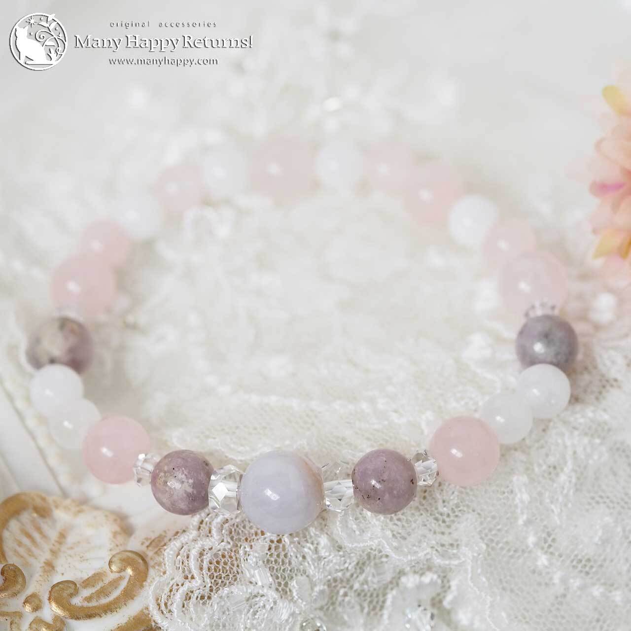 ラベンダー翡翠をメインに、ハックマナイト、ローズクォーツ、ホワイトジェイドを連ねたブレスレット。