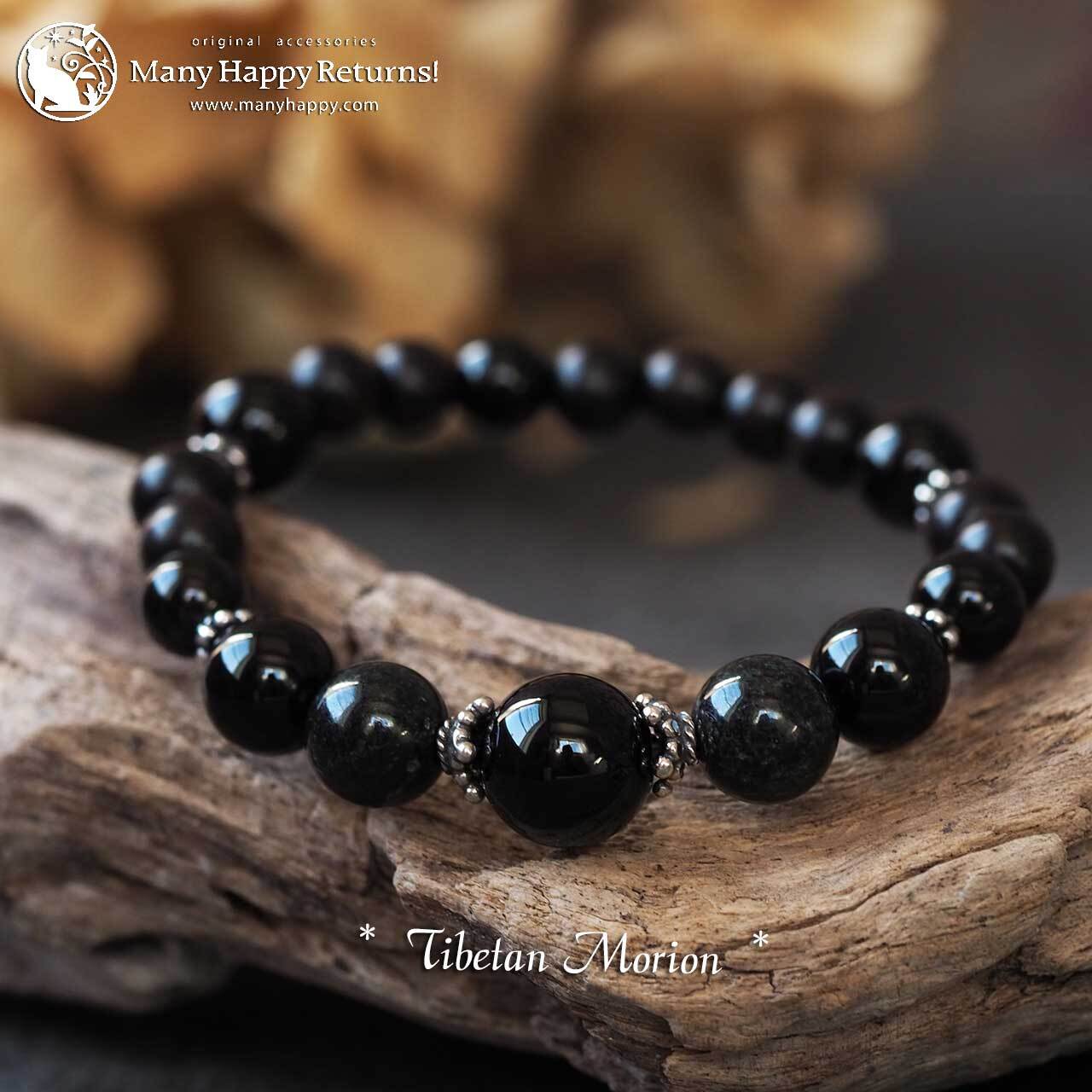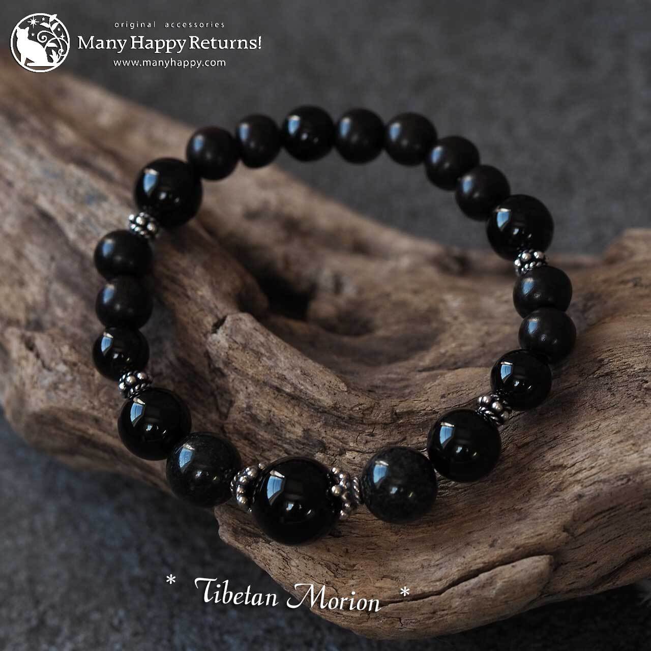 ba-7329 チベタンモリオン&玄武岩&黒檀☆SV925ストレッチブレス
