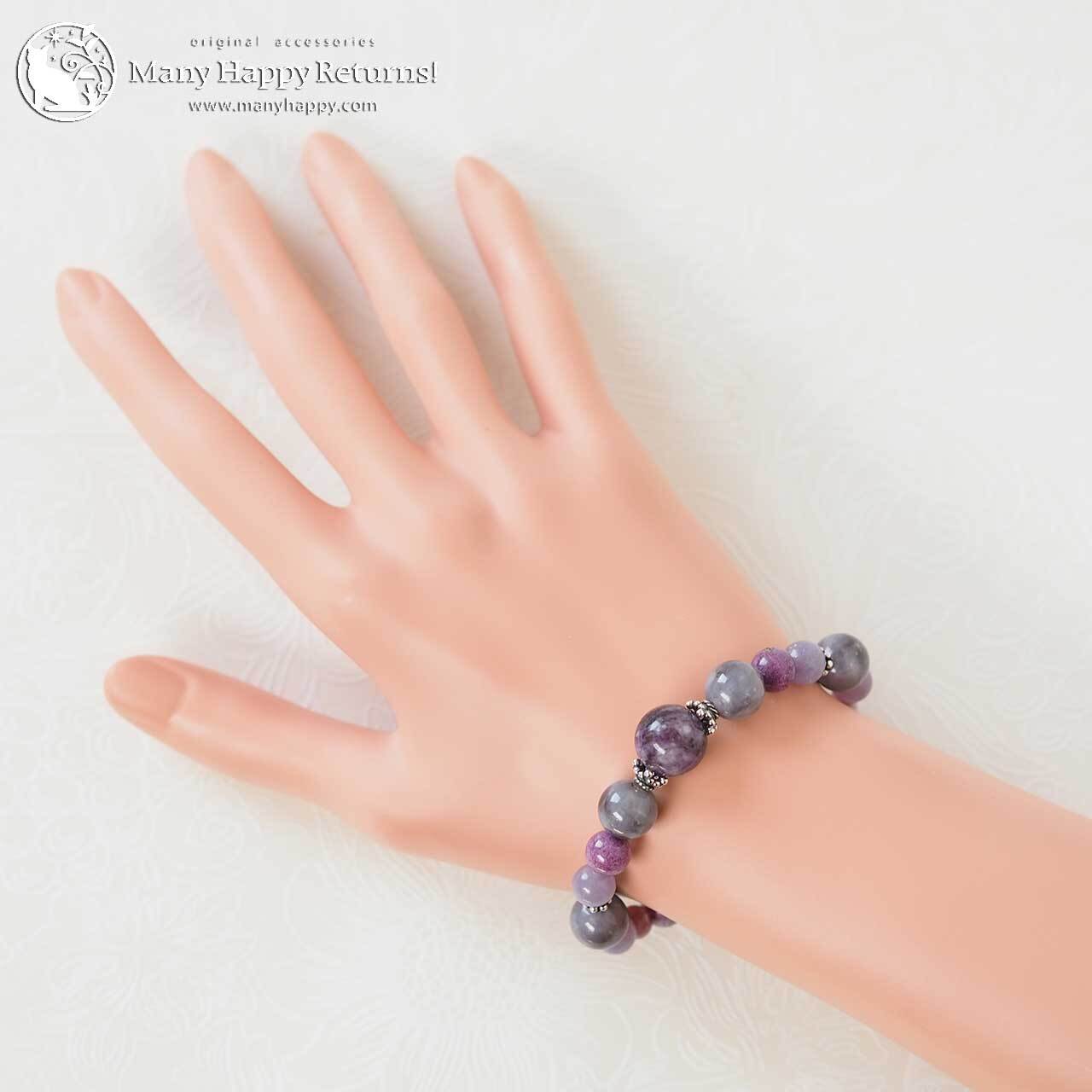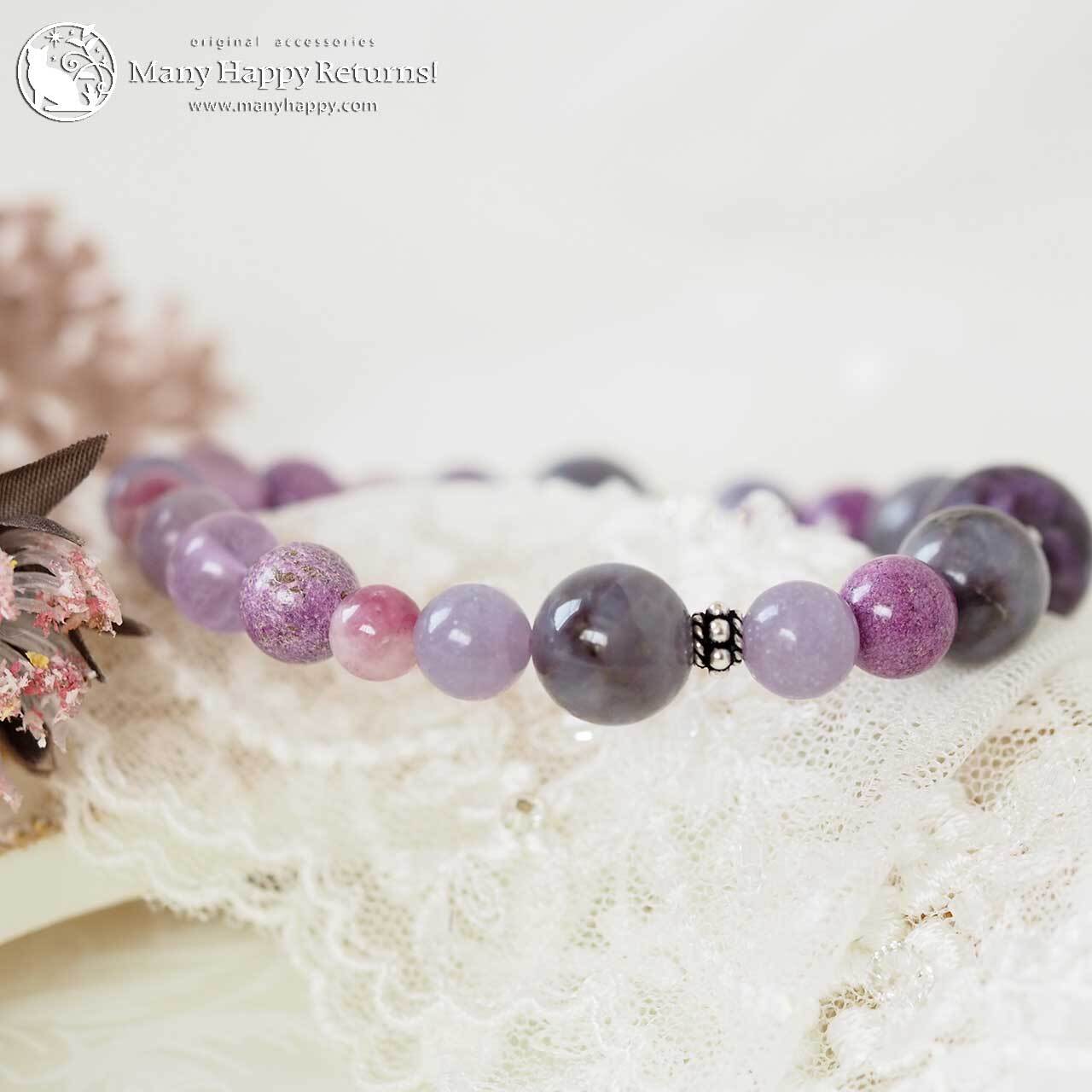 チャロアイトの深い変容のエネルギー、アリゾナヴァイオレットクォーツの大地のような安定とグラウンディング、スティヒタイトのハートを包み込む癒しと自己受容、そしてレピドライトの心を穏やかに整える静かな安心感が重なり合い、内面の調和と優しい変化をもたらすブレスレットに仕上がっています。
