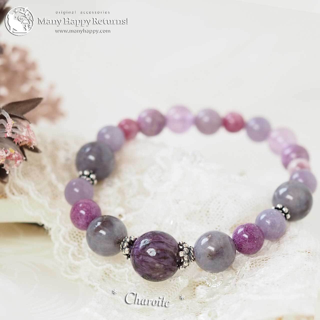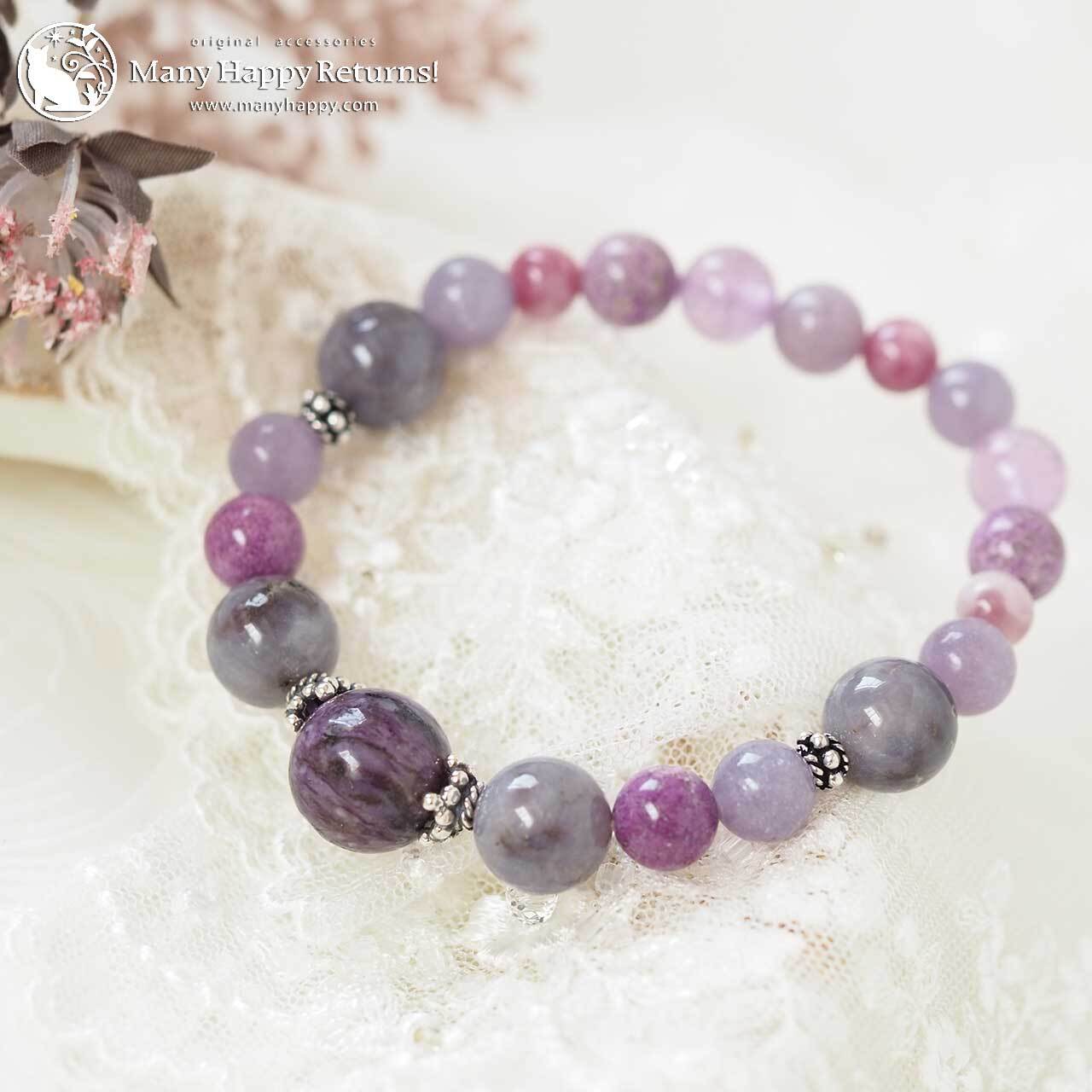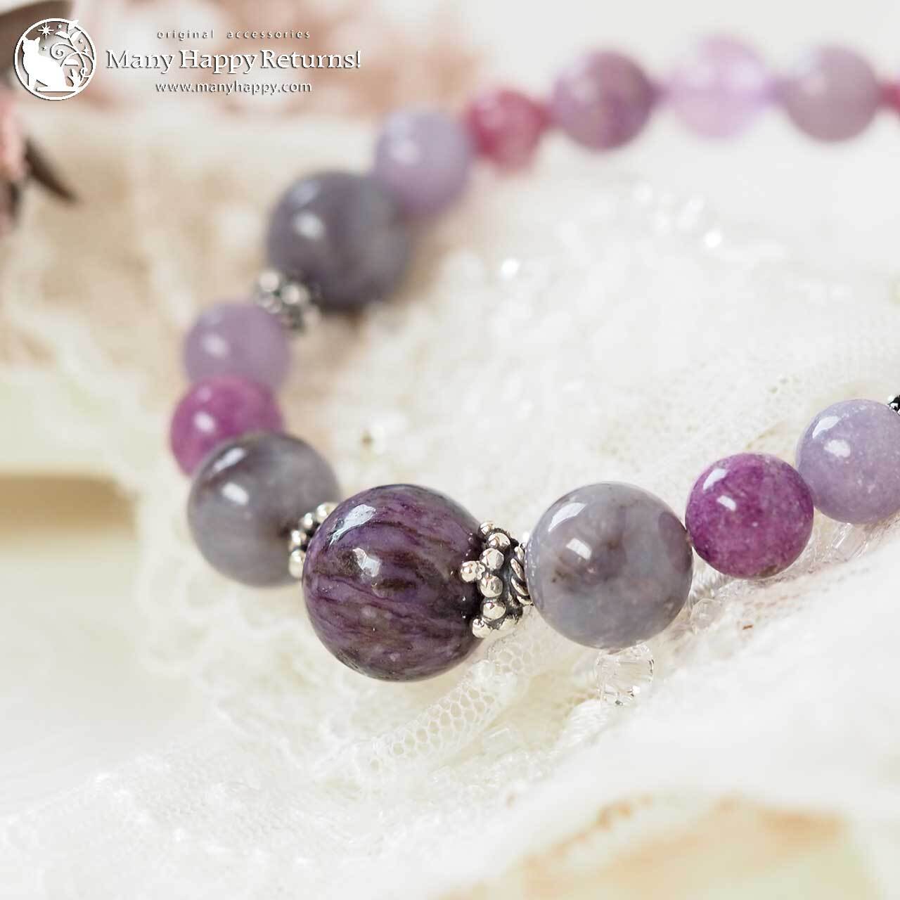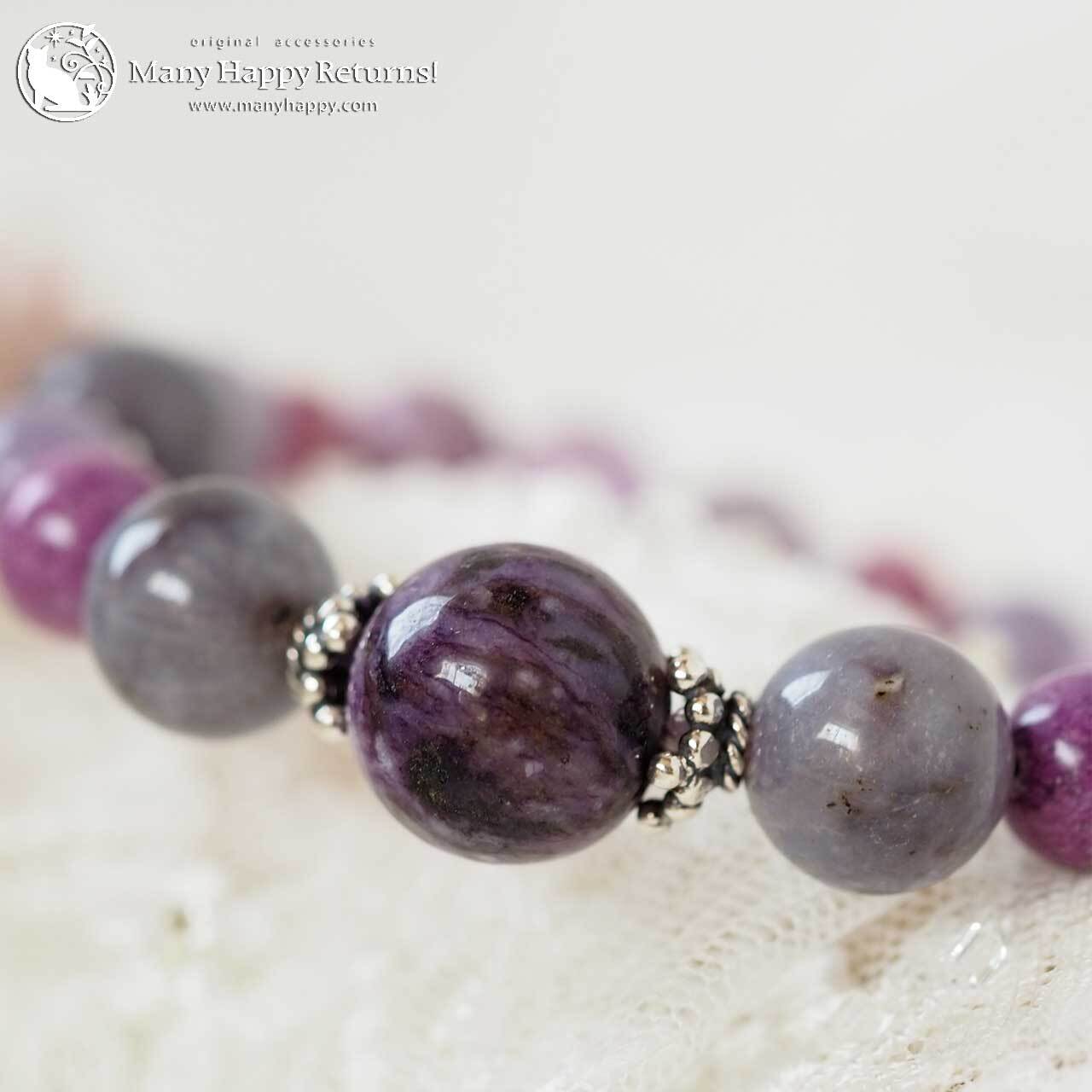 チャロアイトをメインに、アリゾナヴァイオレットクォーツ、スティヒタイト、レピドライトを連ねたブレスレット。