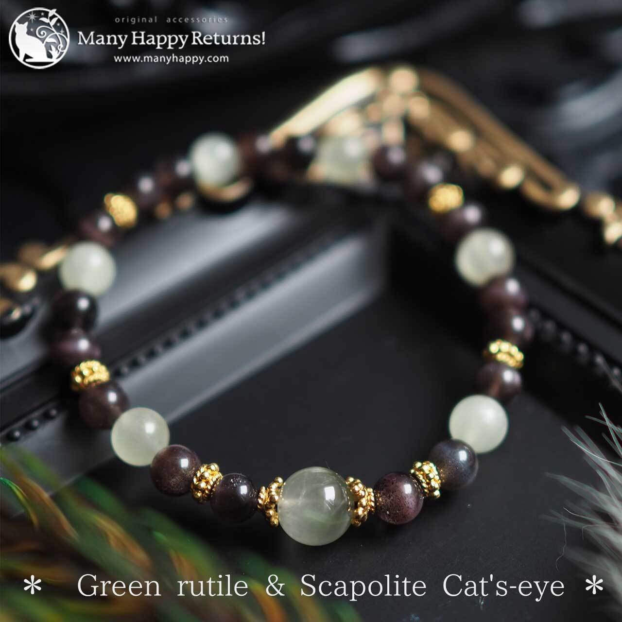 ba-6926 グリーンルチル&スキャポライトキャッツアイ&グリーンカルサイト☆SV925ストレッチブレス ネコポス送料無料