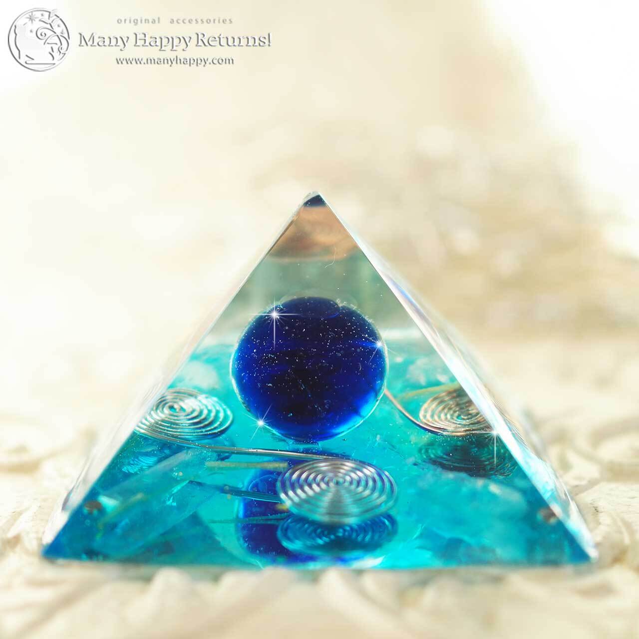 シリコンモールドじゃないので、辺が波打ったりして、工業製品のように完璧じゃないのですが、こだわりのMany Happy Returns!オリジナルのピラミッドオルゴナイトです。