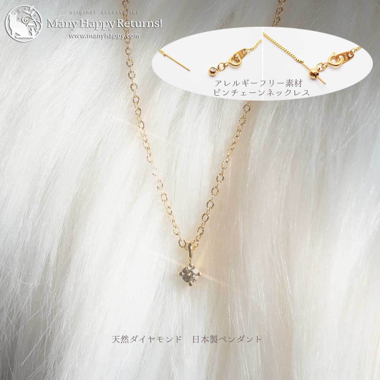 日本製のSV925(K18GP)の天然ダイヤモンドペンダントトップと、アレルギーフリーのステンレス素材ピンチェーンネックレス。