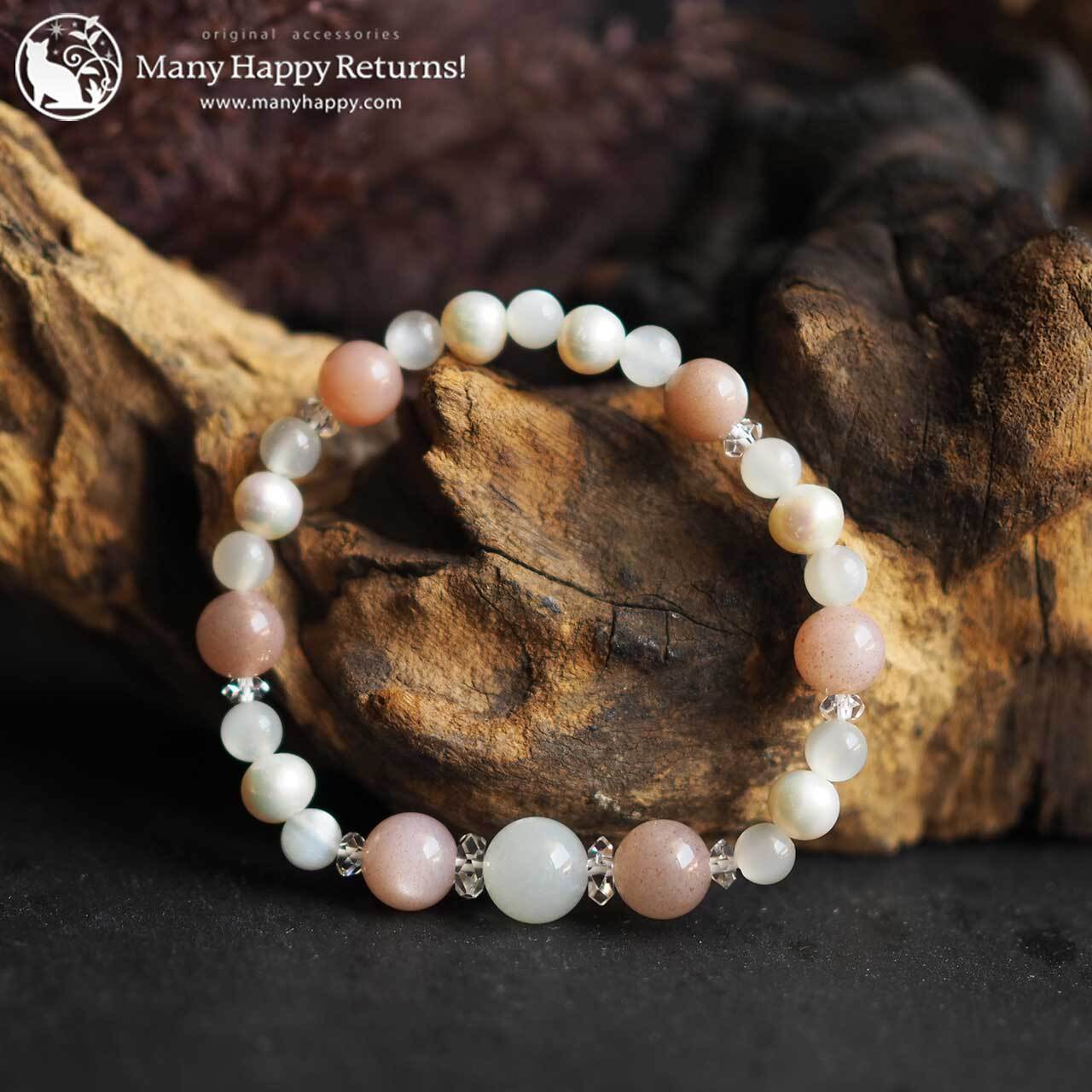 シラーの美しいホワイトムーンストーンと、珍しいピンクムーンストーンを使ったムーンストーンブレス。
