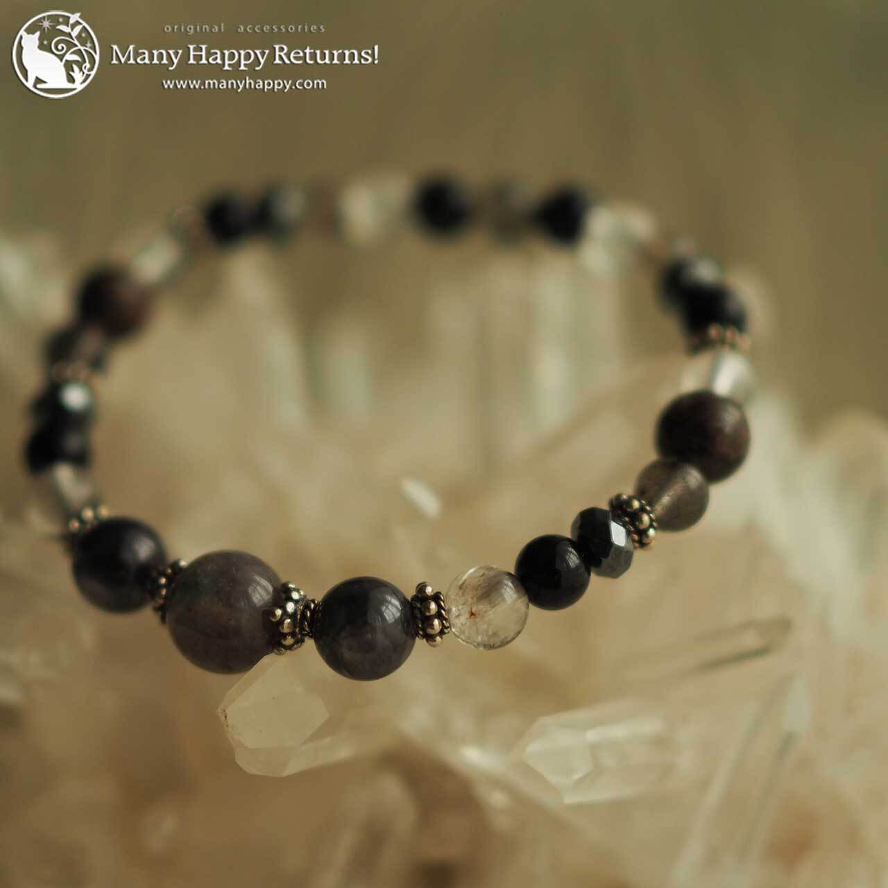 プラチナクォーツや本物のヘマタイト、モリオン、美しいシラーのラブラドライトなど、様々な石を合わせた特別なブレスレットです。