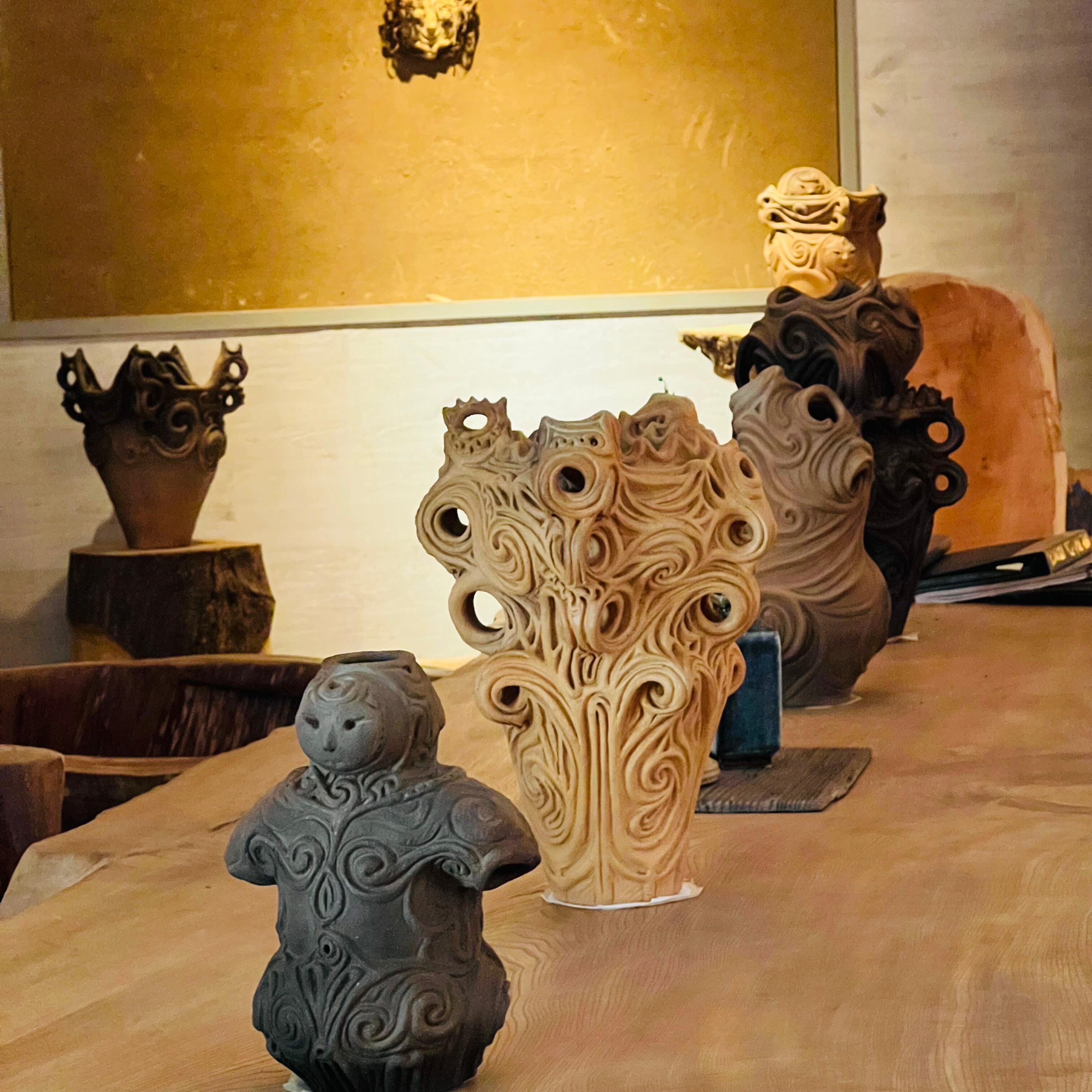 縄文時代の住居に囲まれた異世界で暮らすアーティストさんが、縄文時代と繋がって制作している縄文土器。